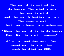 You may never have heard this, but back in 1987 when Squaresoft released Final Fantasy in Japan, they were near bankrupt. That is of course, was why the game was titled Final Fantasy. This game sold well, and it's only competition was Dragon Warrior. It has a weak storyline compared to today's standards. You are out to get four crystals that were stolen. You are to retrieve them and find the source of all evil. Final Fantasy proved to be a fine game back then. Obviously, it spawned many sequels which I am sure you have played! |